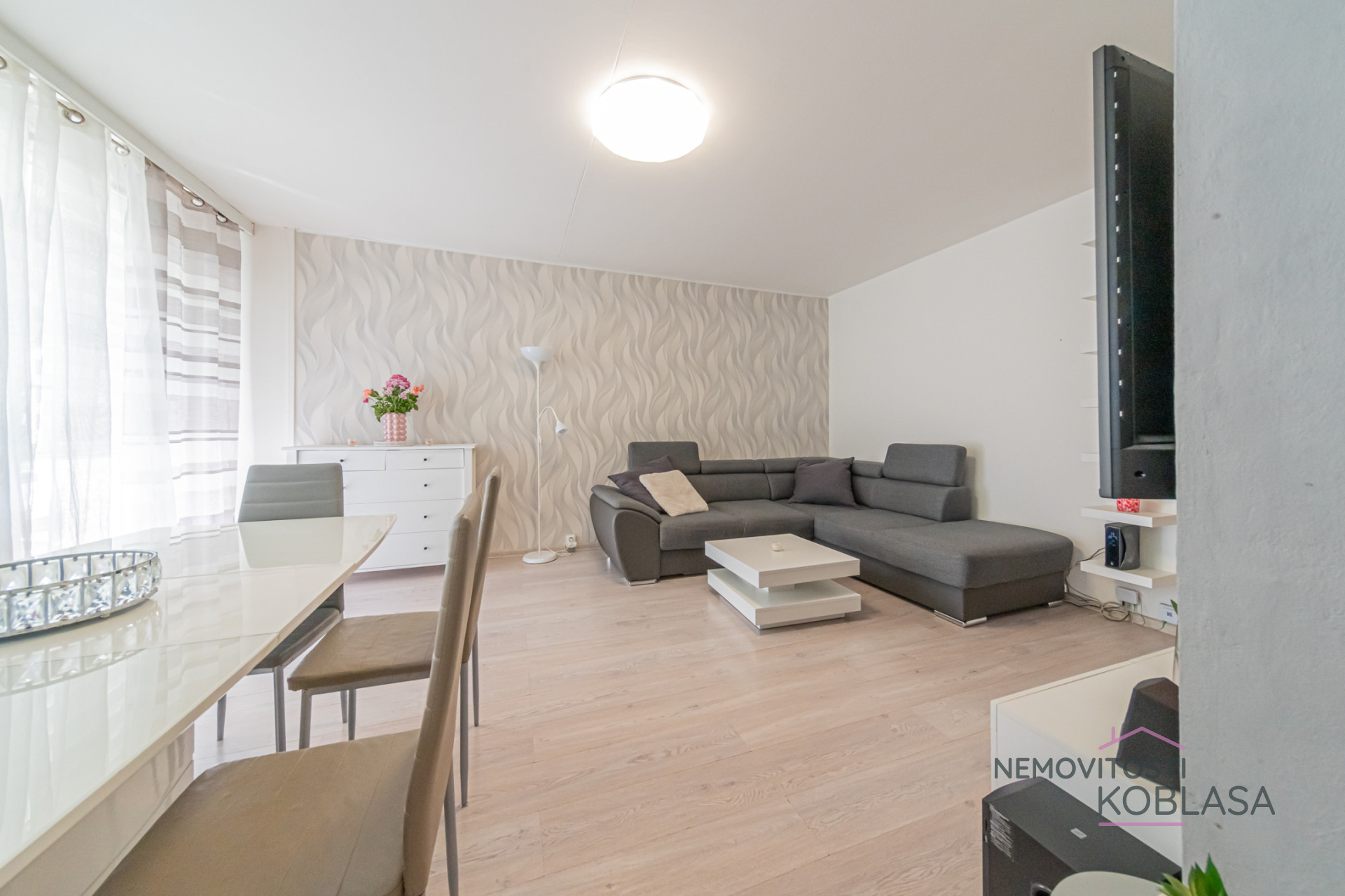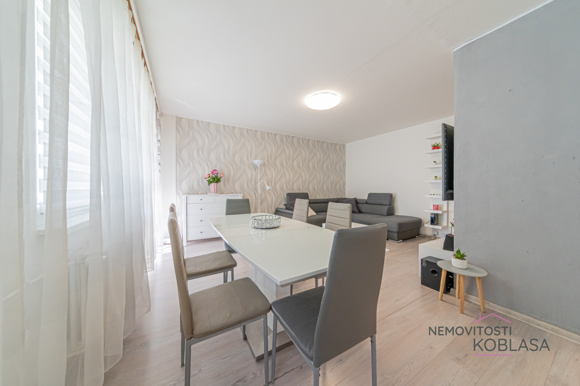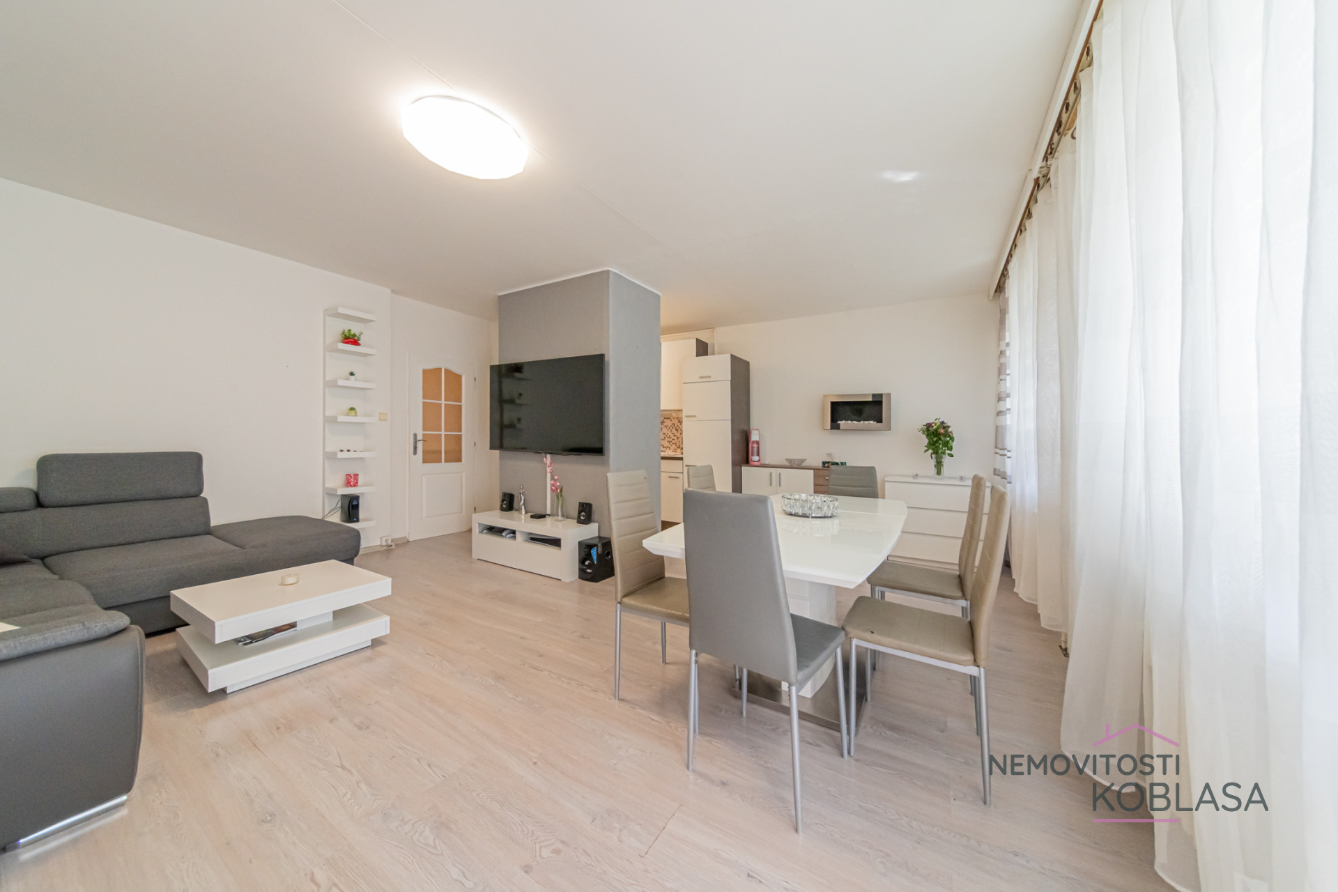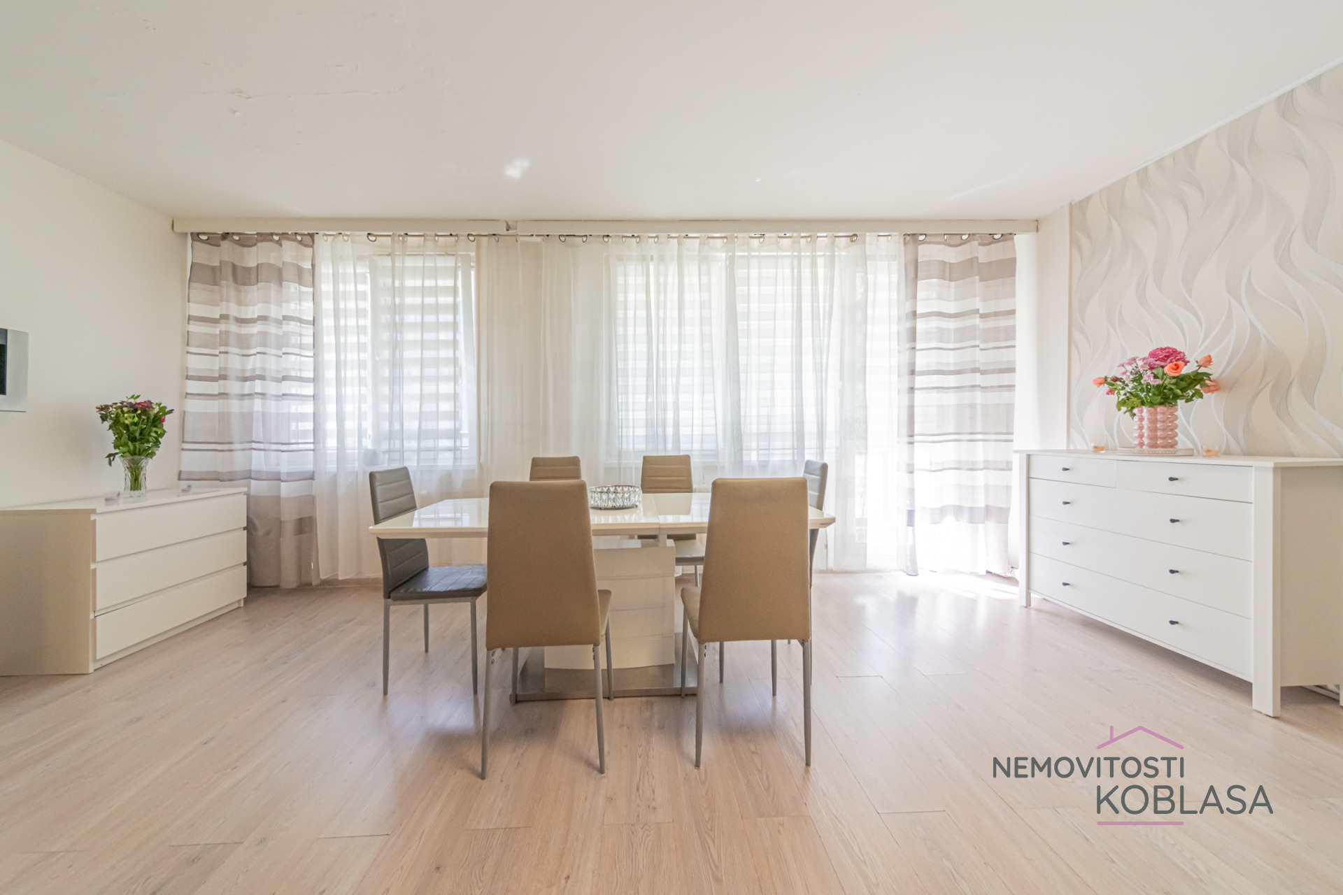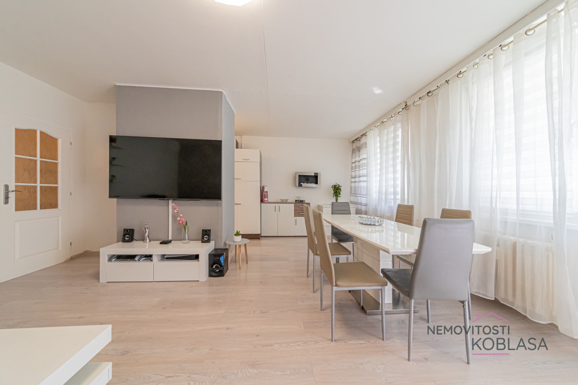 • světlý obývací pokoj propojený s kuchyní a jídelním koutem, ze kterého je vstup na velkou lodžii