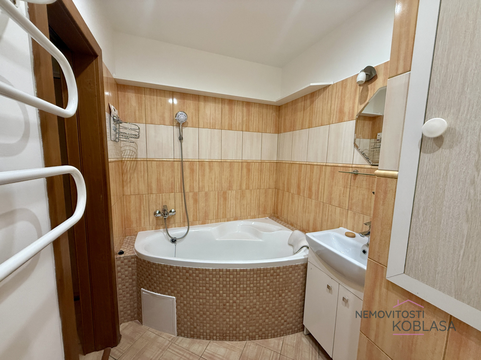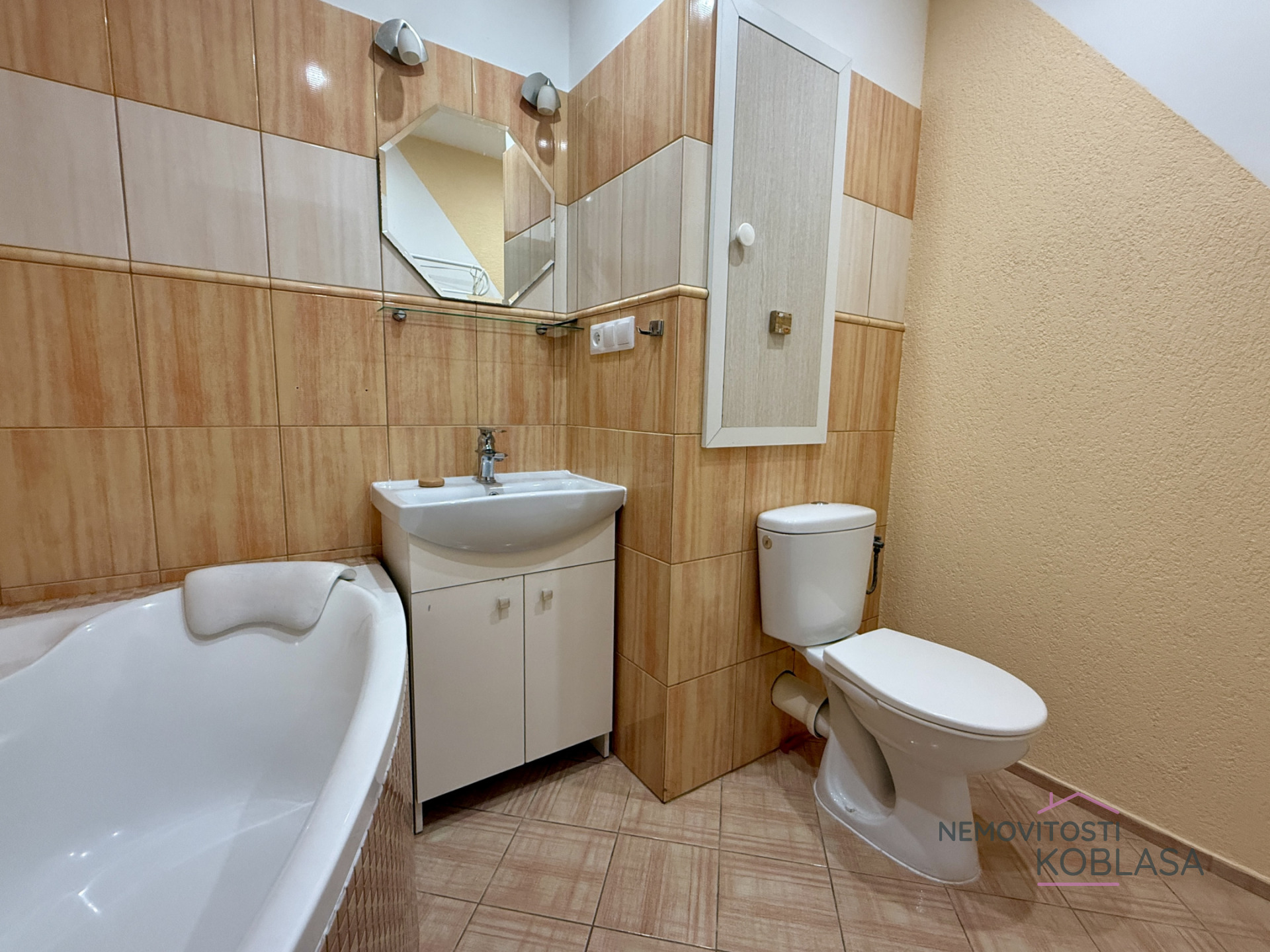 • koupelna s rohovou vanou, umyvadlem a toaletou,